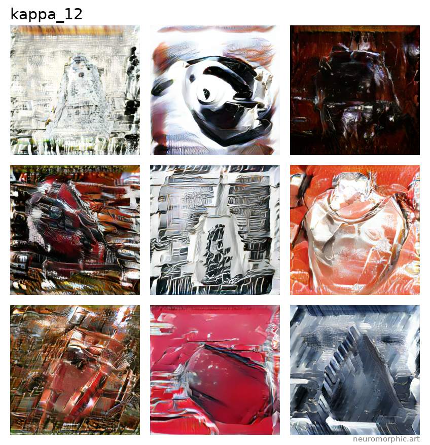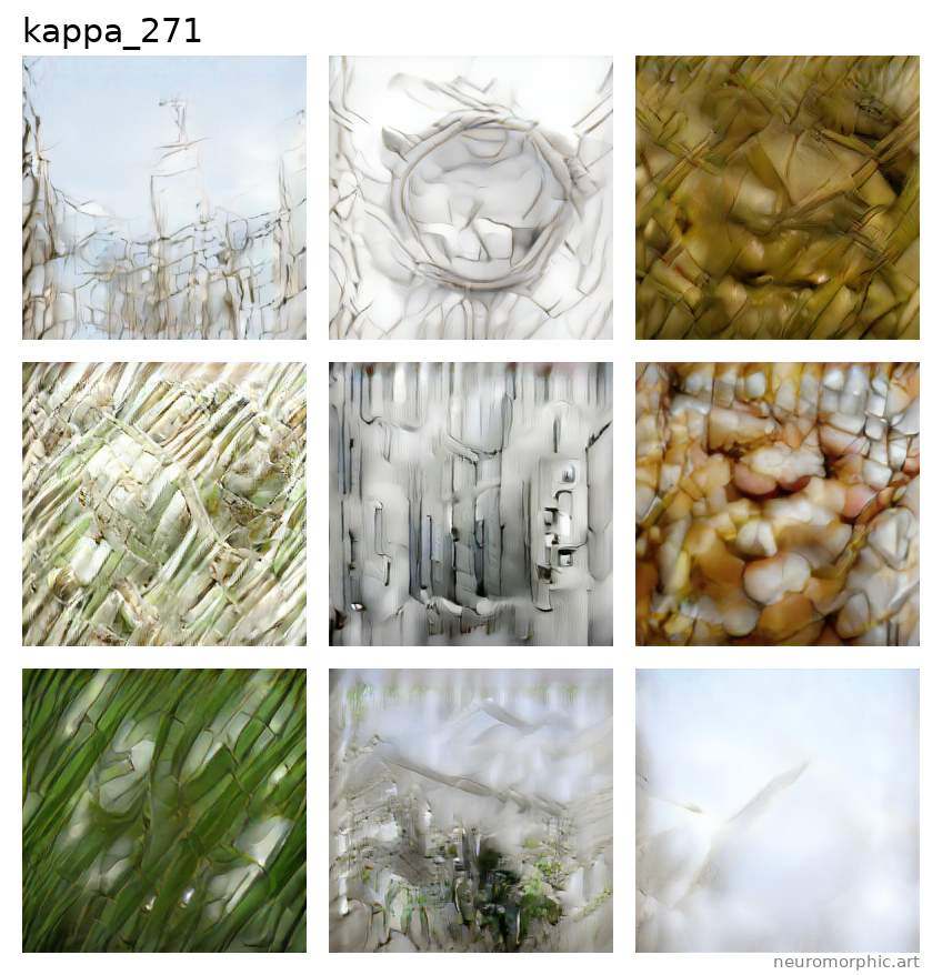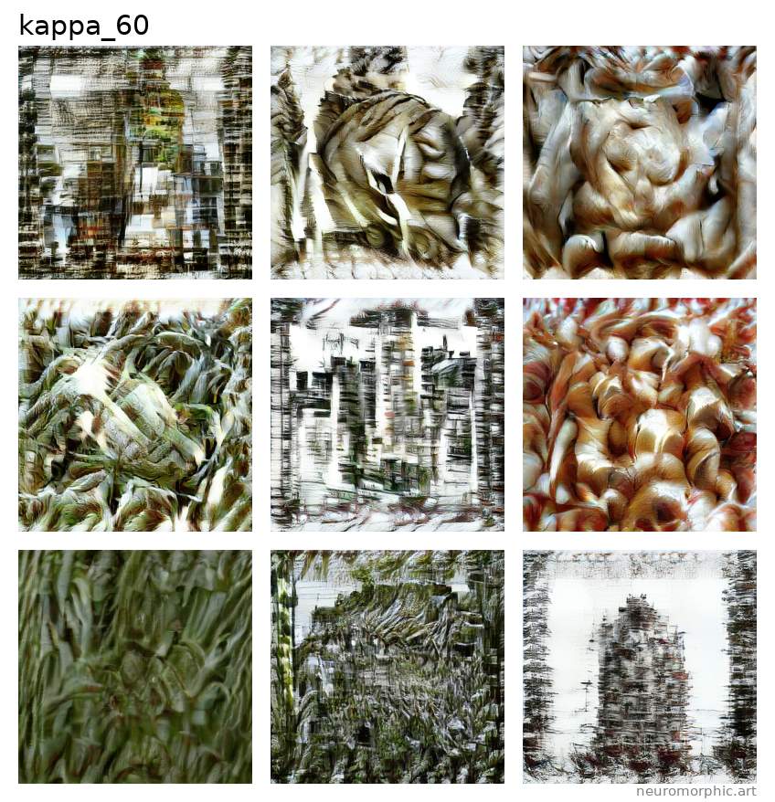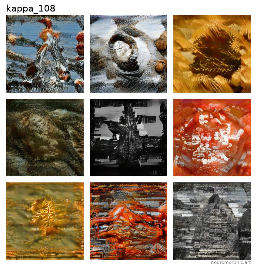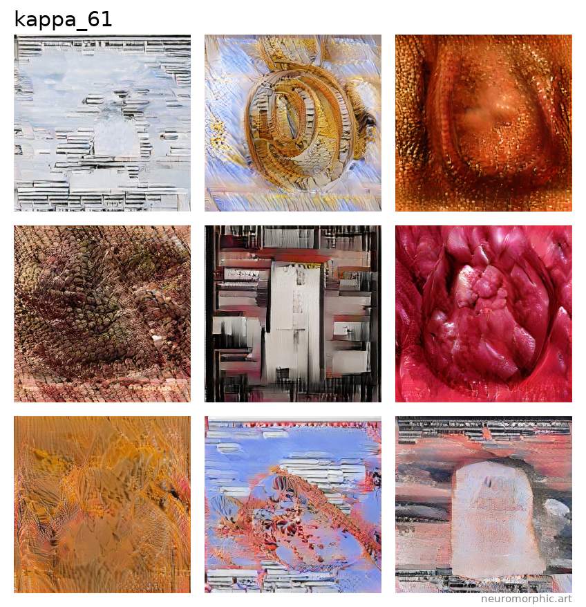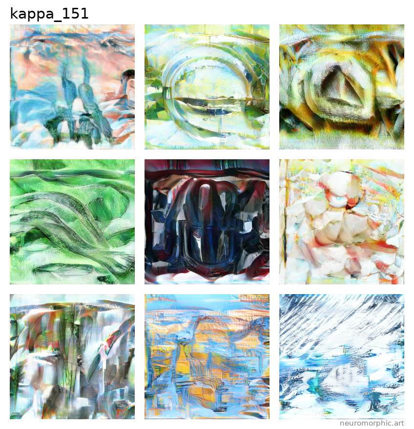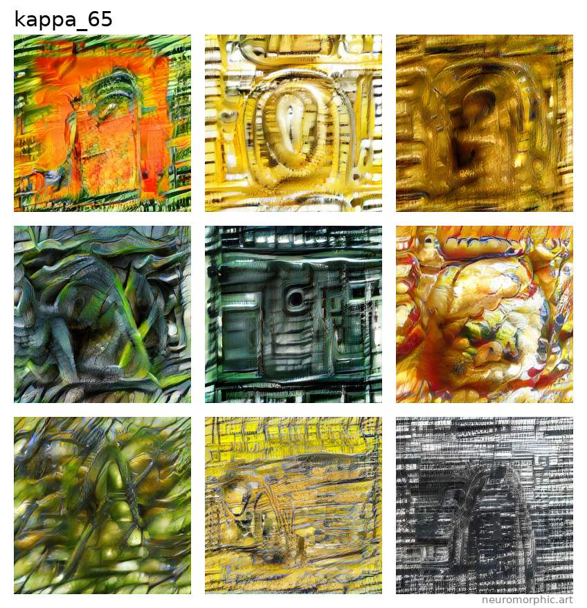 Each plate shown below was created by one of the neural networks belonging to the kappa family. The particular neuromorphic artist network is singled out by the identifier shown at the top of the plate — the neural network's “name”.