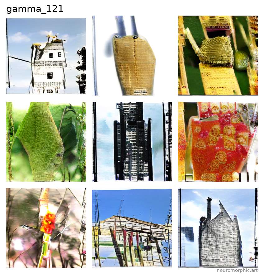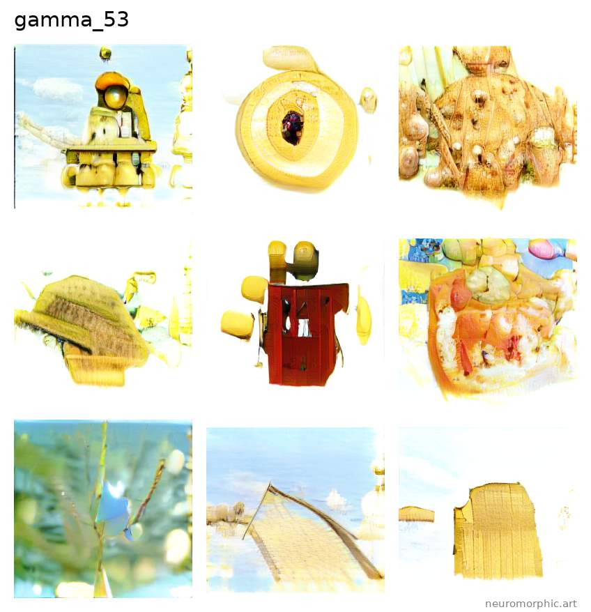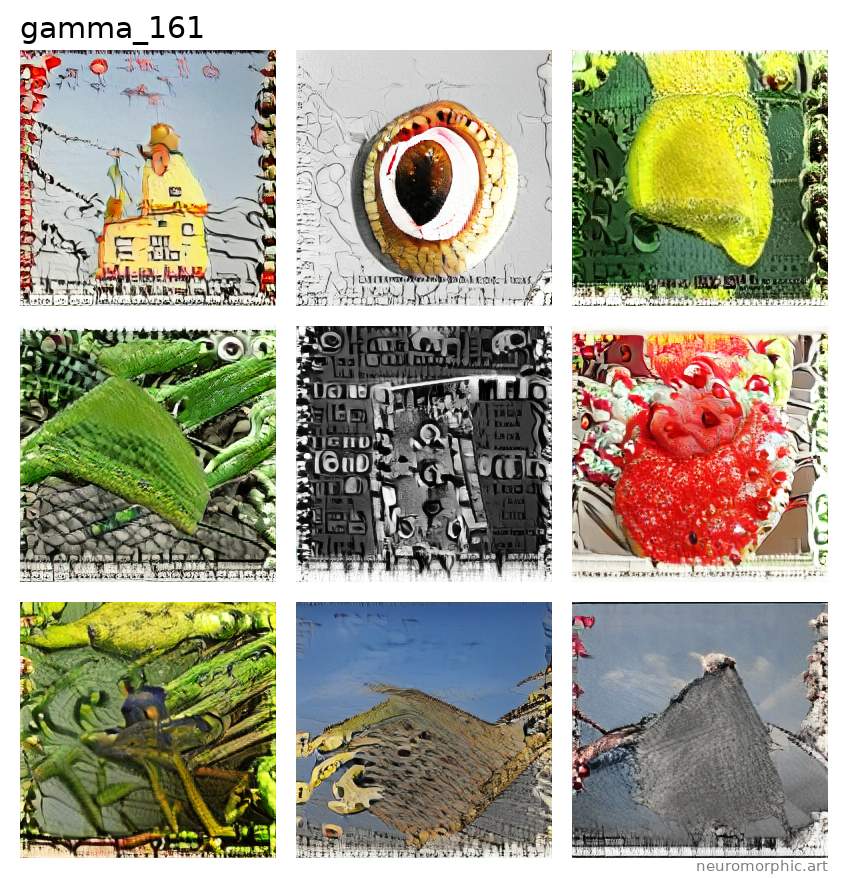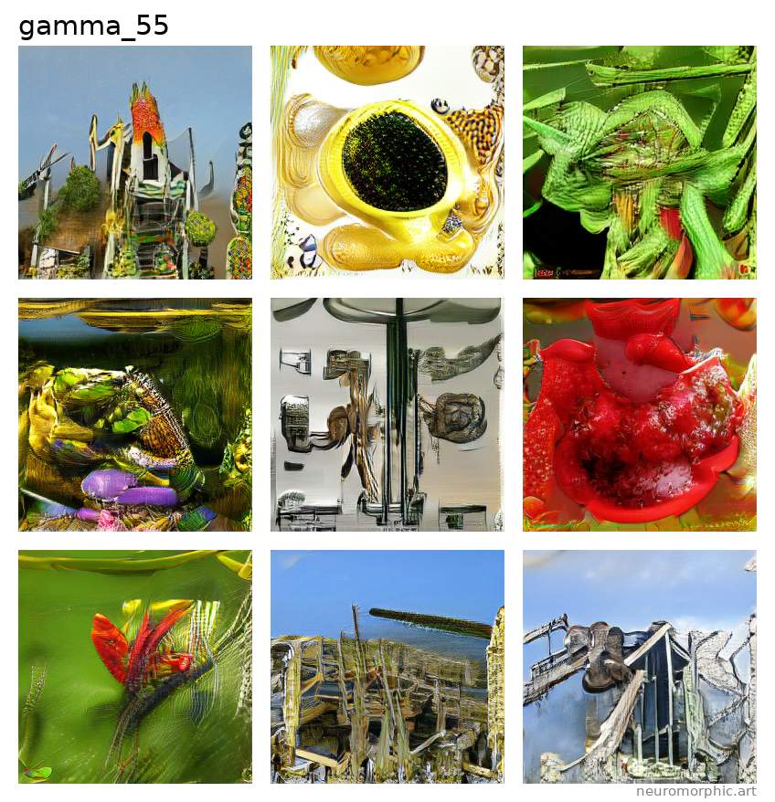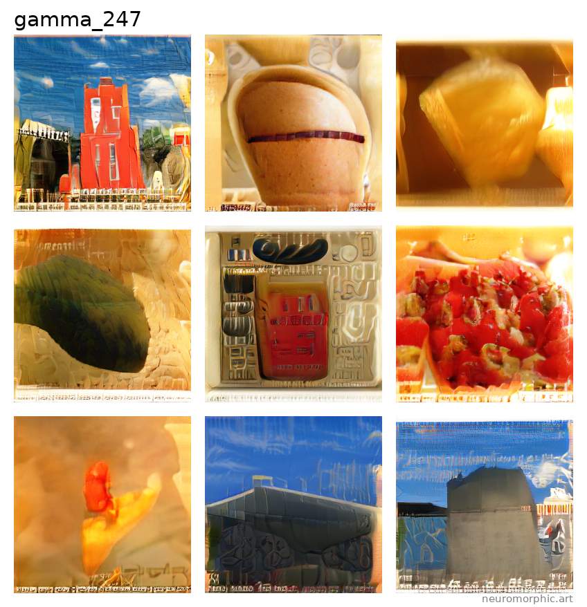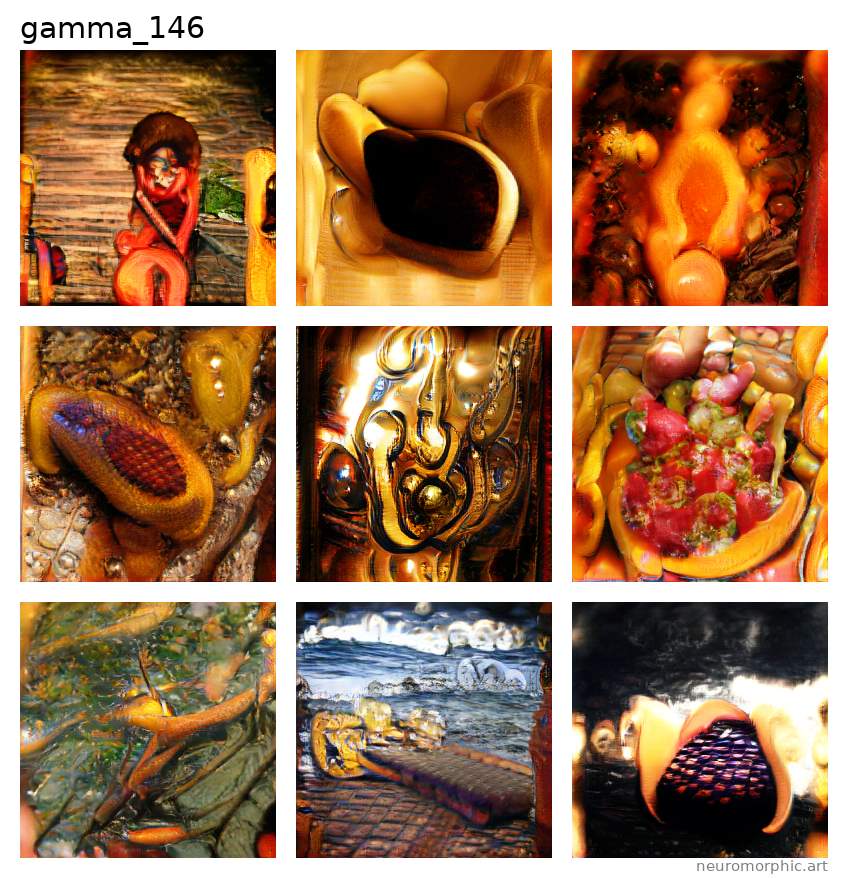 Each plate shown below was created by one of the neural networks belonging to the gamma family. The particular neuromorphic artist network is singled out by the identifier shown at the top of the plate — the neural network's “name”.