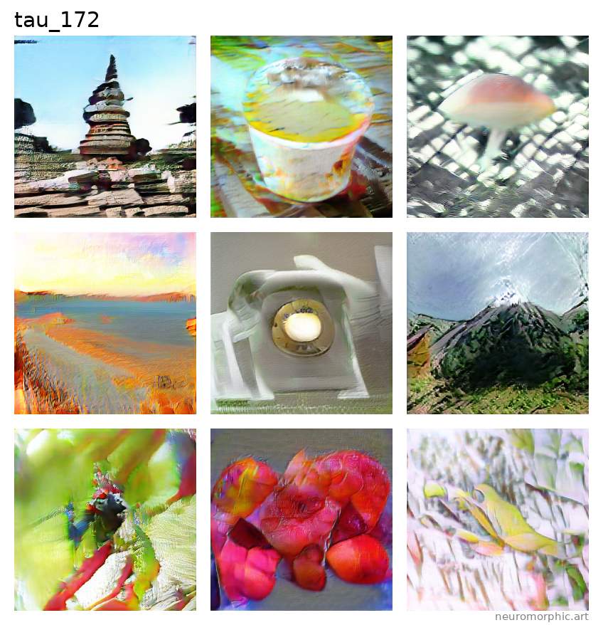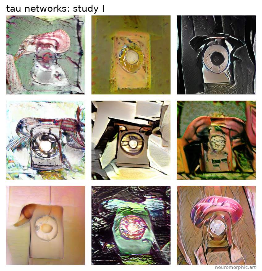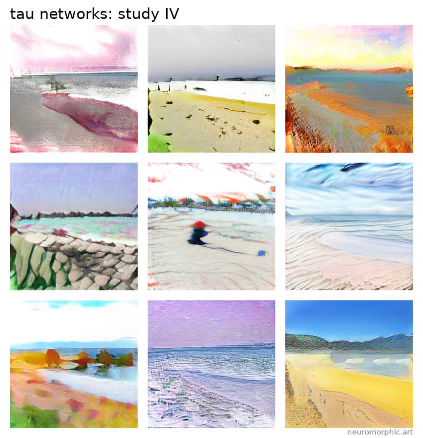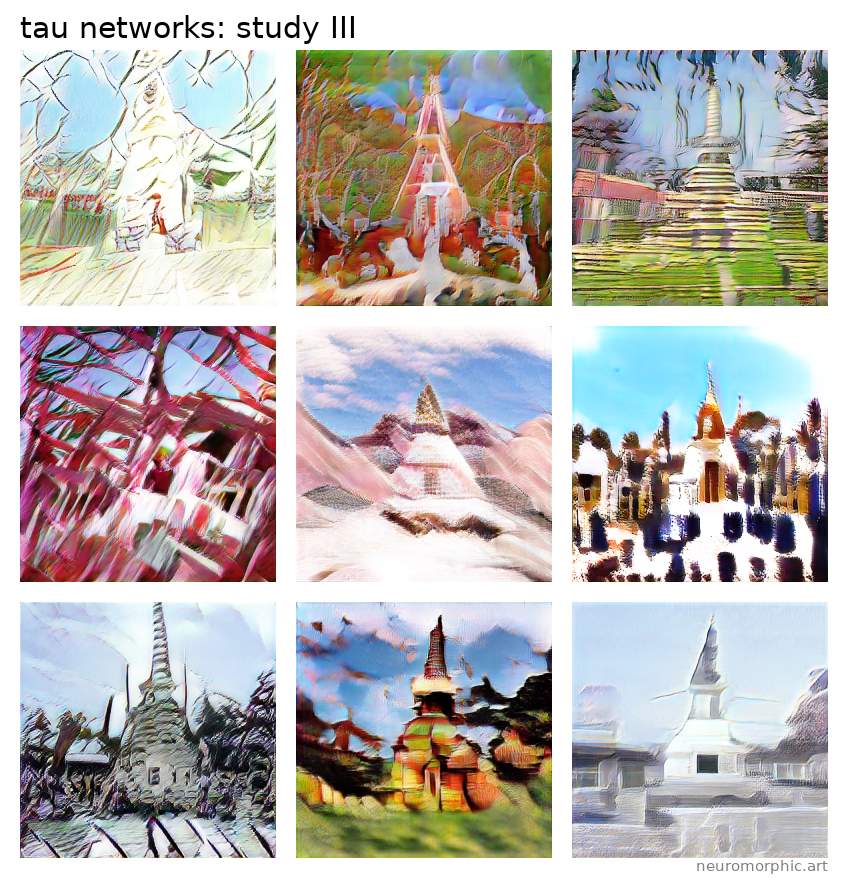 Each plate shown below was created by one of the neural networks belonging to the tau family. The particular neuromorphic artist network is singled out by the identifier shown at the top of the plate — the neural network's “name”.