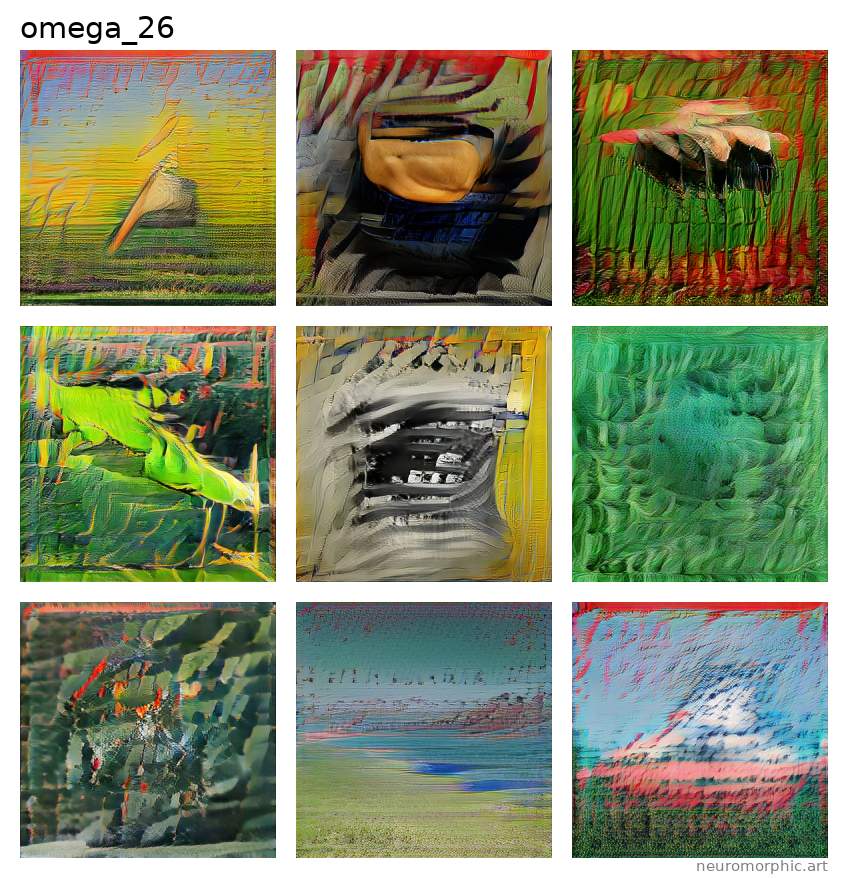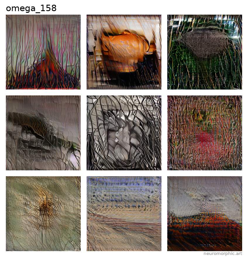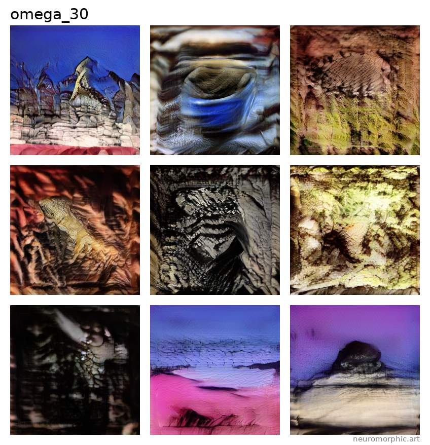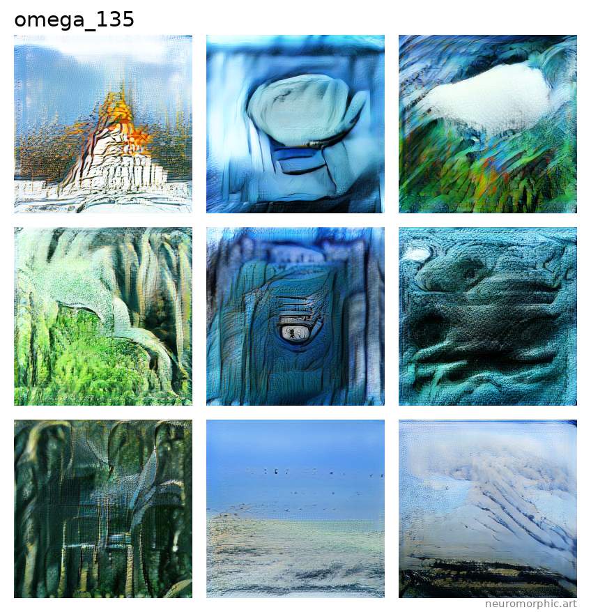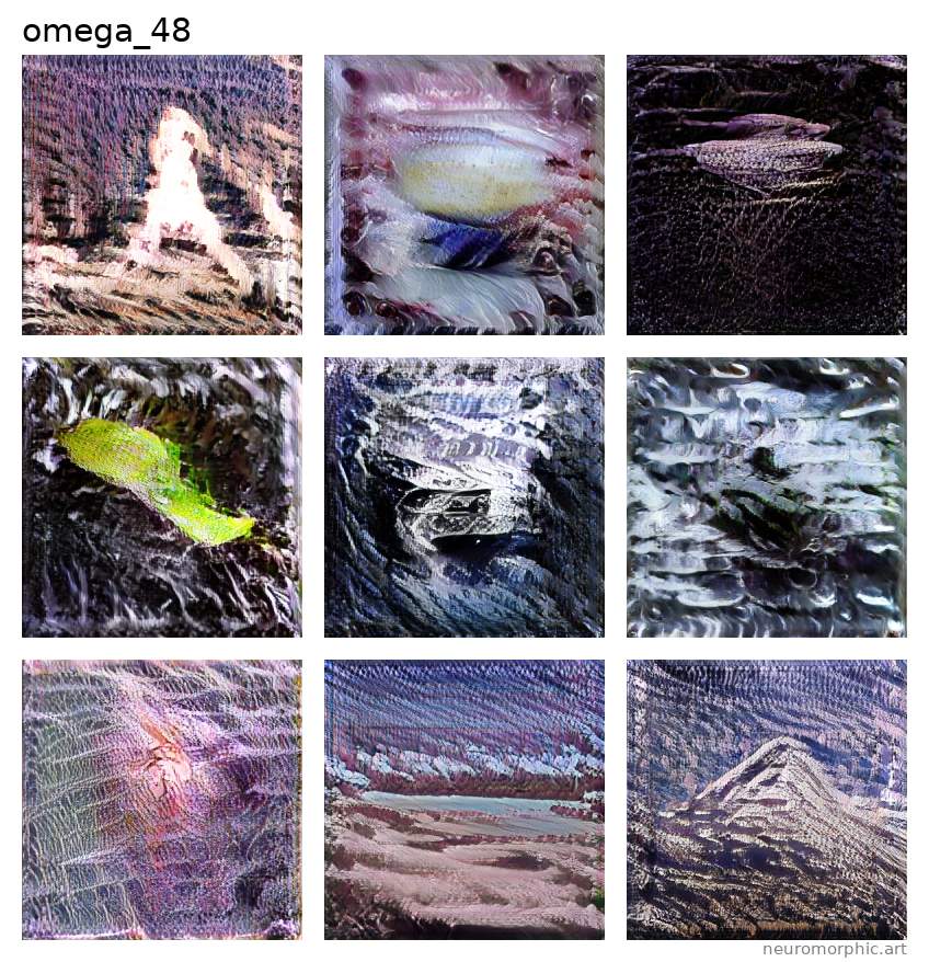 Each plate shown below was created by one of the neural networks belonging to the omega family. The particular neuromorphic artist network is singled out by a numerical identifier shown at the top of the plate — the neural network's “name”.