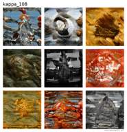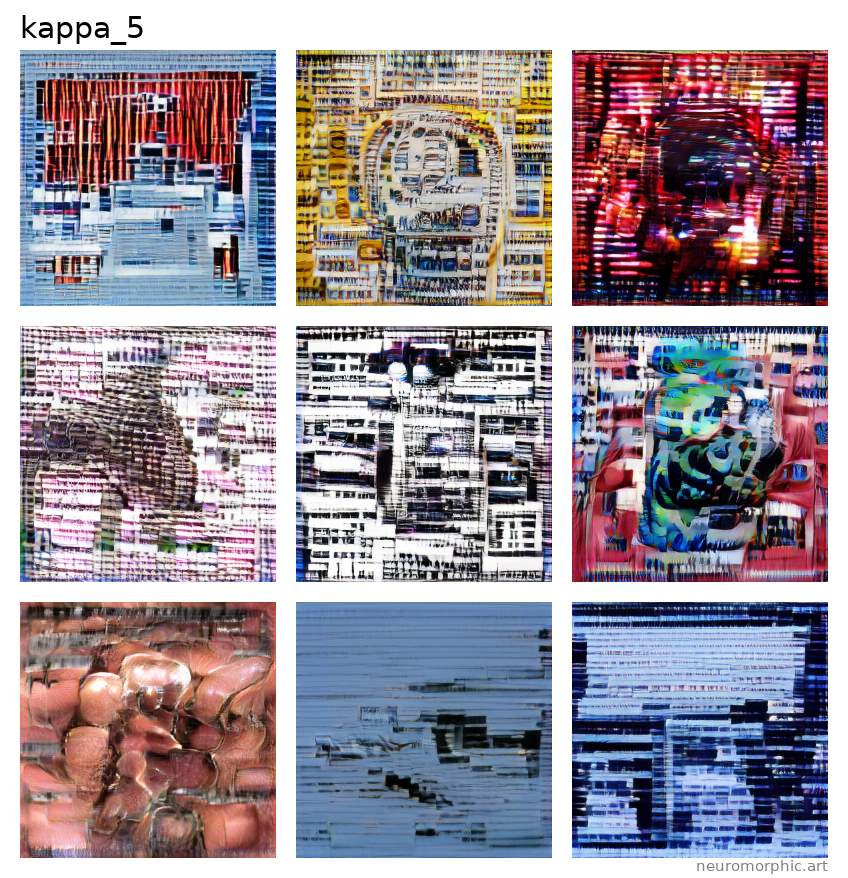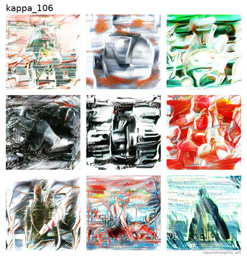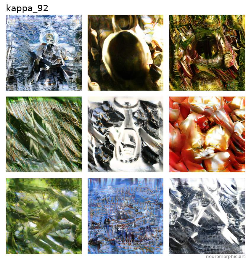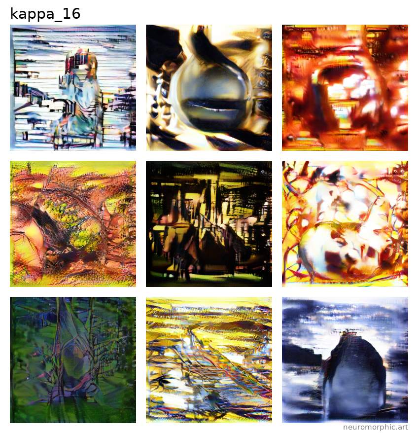 Each plate shown below was created by one of the neural networks belonging to the kappa family. The particular neuromorphic artist network is singled out by the identifier shown at the top of the plate — the neural network's “name”.
