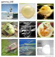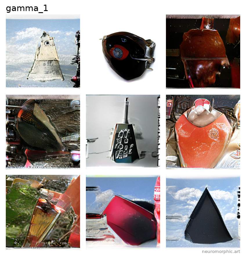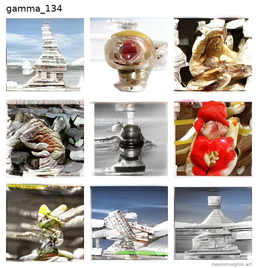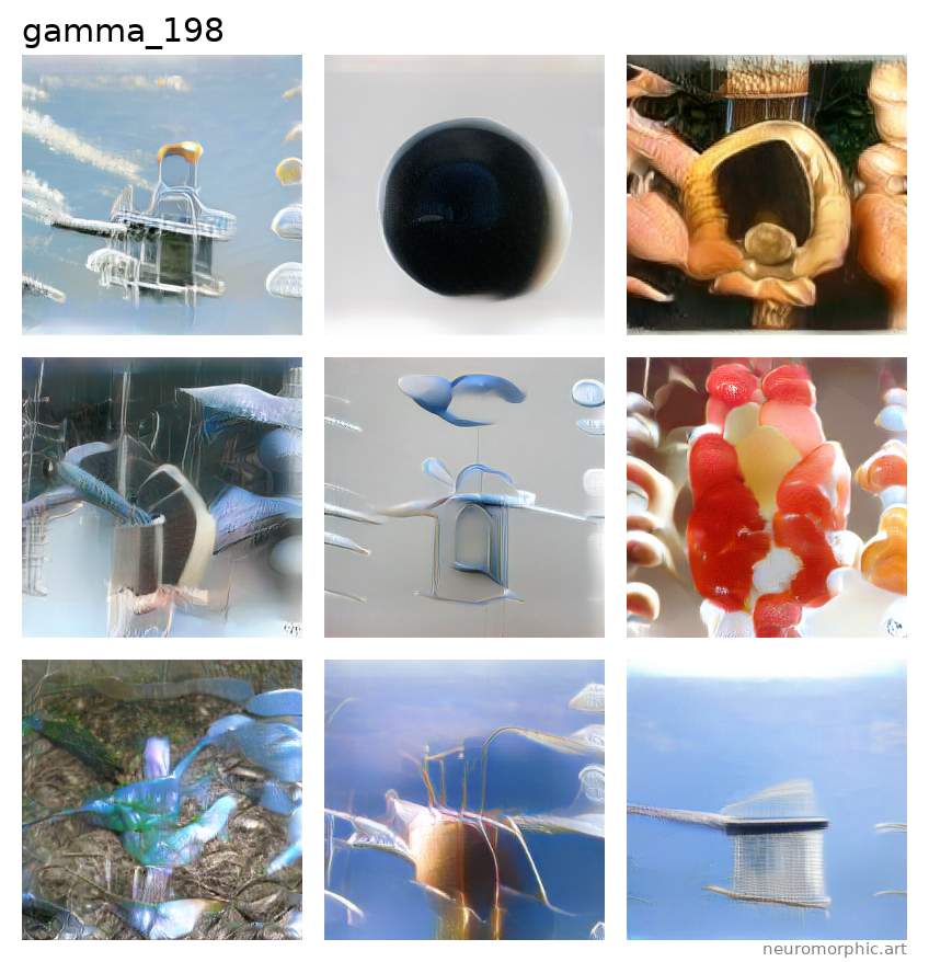 Each plate shown below was created by one of the neural networks belonging to the gamma family. The particular neuromorphic artist network is singled out by the identifier shown at the top of the plate — the neural network's “name”.