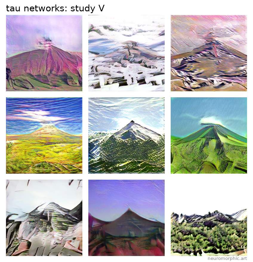 Each plate shown below was created by one of the neural networks belonging to the tau family. The particular neuromorphic artist network is singled out by the identifier shown at the top of the plate — the neural network's “name”.