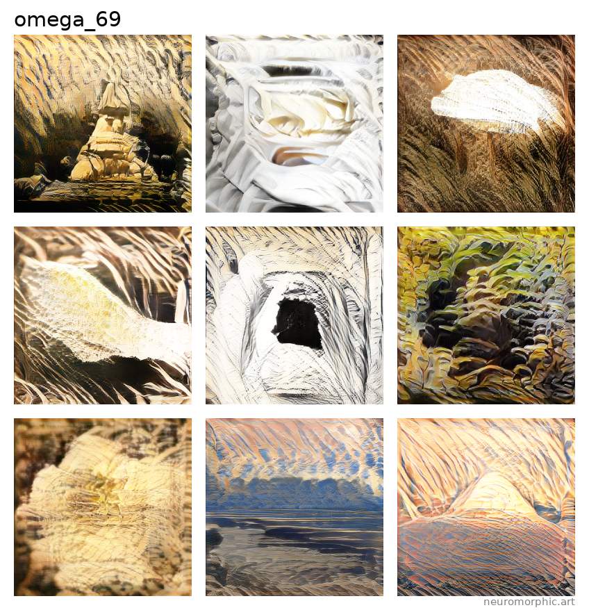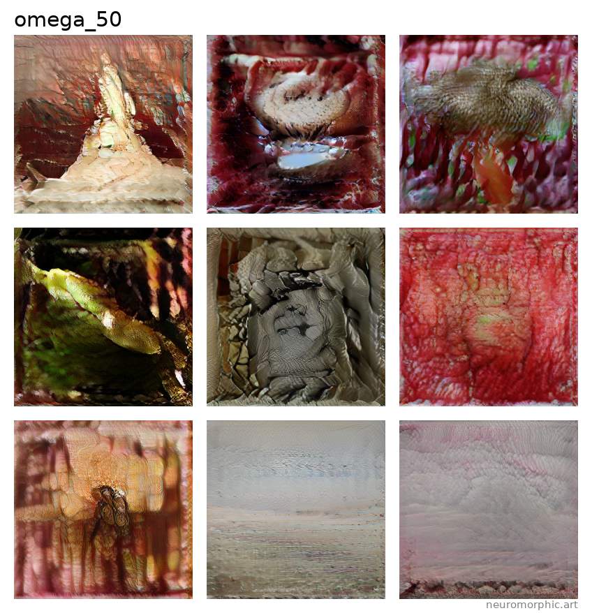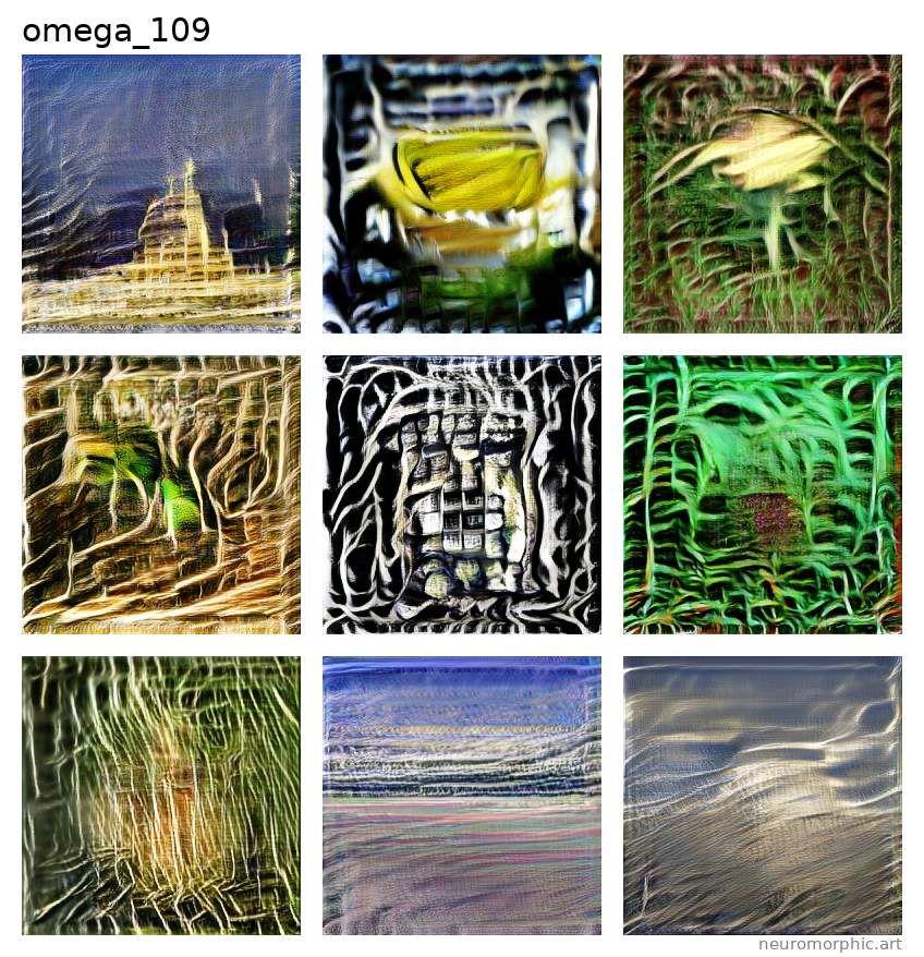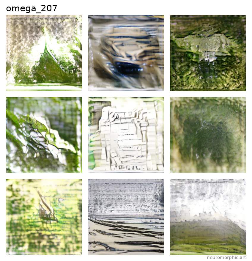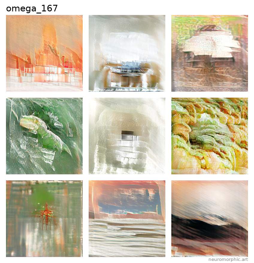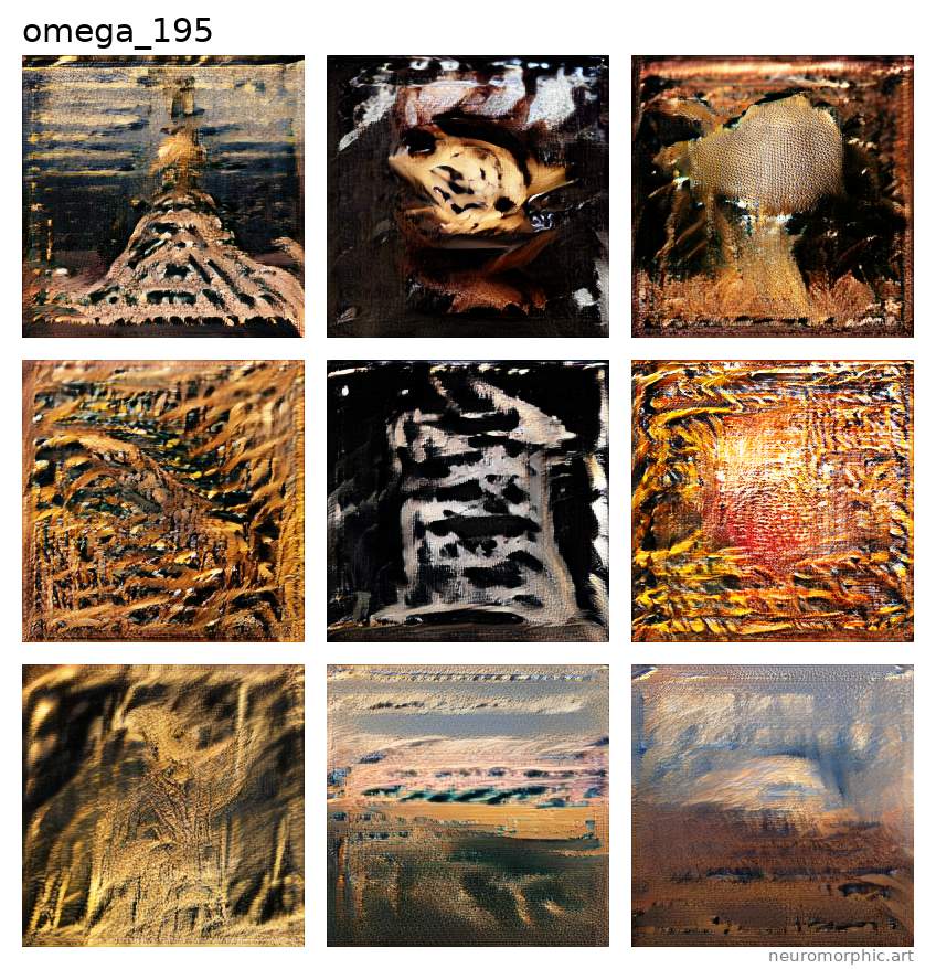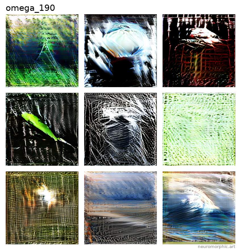 Each plate shown below was created by one of the neural networks belonging to the omega family. The particular neuromorphic artist network is singled out by a numerical identifier shown at the top of the plate — the neural network's “name”.